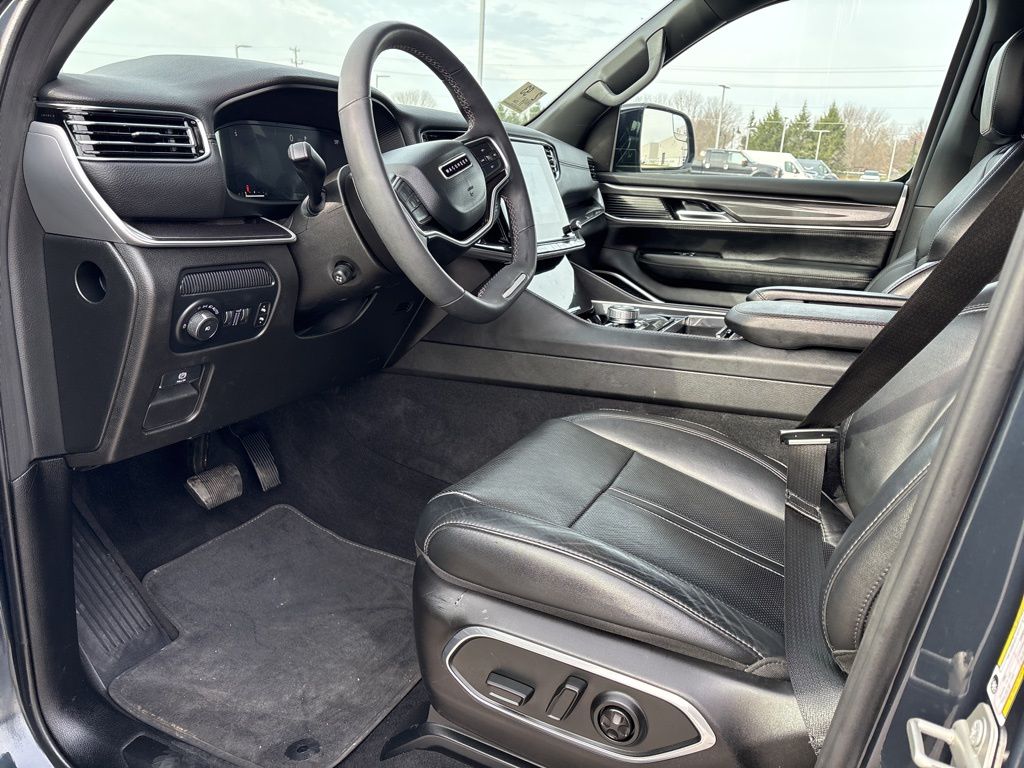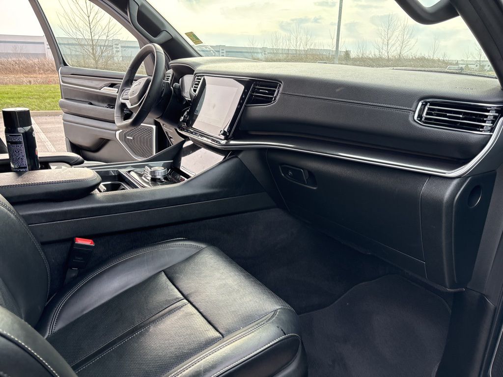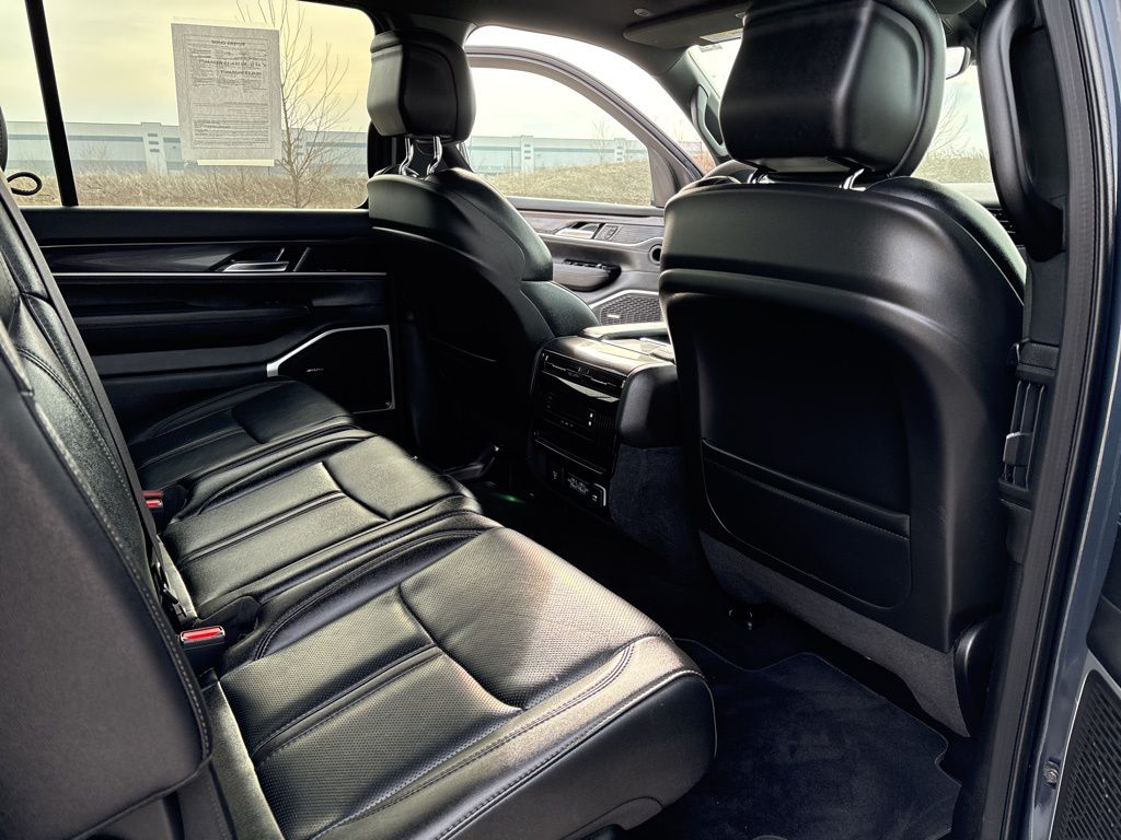 CARFAX One-Owner. 3 Panel Sunroof, 3rd row seats: bench, Adjustable Roof Rail Crossbars, Cargo Cover, Front dual zone A/C, Navigation System, Power Liftgate, Premium Group I, Rear window defroster, Reversible Carpet/Vinyl Cargo Mat, Wheels: 20" x 9.0" Premium 2 Aluminum, 10 Speakers, 3.55 Rear Axle Ratio, 4-Wheel Disc Brakes, ABS brakes, Adjustable pedals, Air Conditioning, AM/FM radio: SiriusXM with 360L, Anti-whiplash front head restraints, Apple CarPlay/Android Auto, Audio memory, Auto-dimming door mirrors, Auto-dimming Rear-View mirror, Auto-leveling suspension, Automatic temperature control, Brake assist, Bumpers: body-color, Compass, Delay-off headlights, Driver door bin, Driver vanity mirror, Driver's Seat Mounted Armrest, Dual front impact airbags, Dual front side impact airbags, Electronic Stability Control, Emergency communication system: Wagoneer Connect, Exterior Parking Camera Rear, Four wheel independent suspension, Front anti-roll bar, Front Bucket Seats, Front Center Armrest w/Storage, Front fog lights, Front reading lights, Fully automatic headlights, Garage door transmitter, Heated door mirrors, Heated front seats, Heated steering wheel, Illuminated entry, Knee airbag, Leather Trimmed Bucket Seats, Low tire pressure warning, Memory seat, Normal Duty Suspension, Occupant sensing airbag, Outside temperature display, Overhead airbag, Overhead console, Panic alarm, Passenger door bin, Passenger seat mounted armrest, Passenger vanity mirror, Pedal memory, Power adjustable front head restraints, Power door mirrors, Power driver seat, Power passenger seat, Power steering, Power windows, Quick Order Package 25E, Radio data system, Radio: Uconnect 5 Nav w/10.1" Display, Rear air conditioning, Rear anti-roll bar, Rear dual zone A/C, Rear reading lights, Rear seat center armrest, Rear window wiper, Reclining 3rd row seat, Remote keyless entry, Security system, Speed control, Speed-sensing steering, Speed-Sensitive Wipers, Split folding rear seat, Steering wheel memory, Steering wheel mounted audio controls, Tachometer, Telescoping steering wheel, Tilt steering wheel, Traction control, Trip computer, Turn signal indicator mirrors, Variably intermittent wipers, Ventilated front seats, Voltmeter, Wheels: 18" x 8.0" Aluminum Base Finish, 3 Panel Sunroof, 3rd row seats: bench, Adjustable Roof Rail Crossbars, Cargo Cover, Front dual zone A/C, Navigation System, Power Liftgate, Premium Group I, Rear window defroster, Reversible Carpet/Vinyl Cargo Mat, Wheels: 20" x 9.0" Premium 2 Aluminum. Pricing does not include dealer installed options or equipment. All discounts include financing with Stellantis at standard rates. See dealer for details.